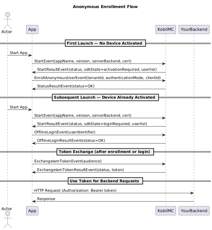 EnrollAnonymousUserEventTriggered when sdkState == ActivationRequired. Registers the device anonymously and retrieves an initial access token.API Reference